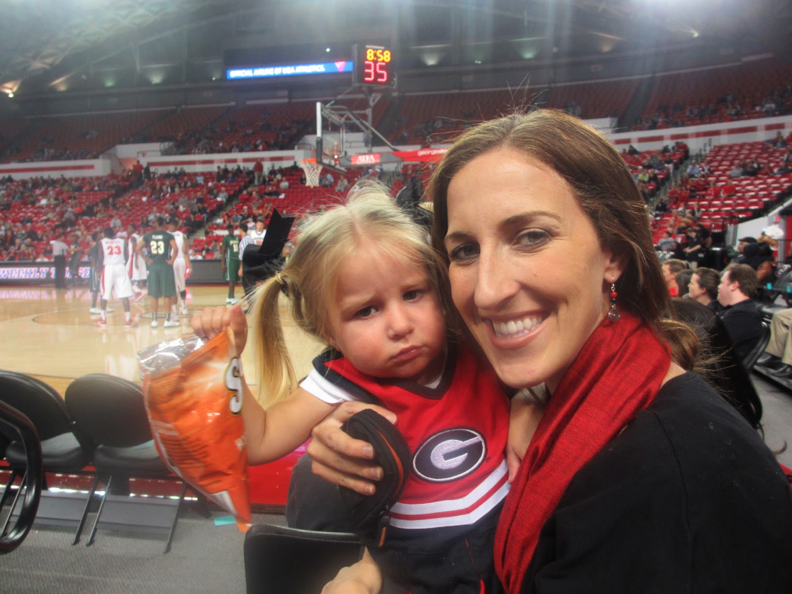 We are back!! And holy cow, am I way behind! I can't believe how long it has been, I think I have about 20 posts before I am caught up. And we have been doing so many fun little things I want to write about! We have some awesome friends, Steve and Robyn, that are huge UGA fans. They have season tickets to the basketball games there so they have invited us to go a couple of times and we had so much fun! The even cooler part about it is that they also get these tickets where you get all you can eat, so we stuffed ourselves, went to the game, then at halftime went back for more food, then watched the rest of the game! How much better can it get? They were so sweet to think of us and the girls loved playing with little Naomi and even made another friend as well:) (I can't believe I didn't even get a picture with Robyn, Steve and Naomi in it, but it is kind of distracting trying to actually watch the game AND take care of the kids!)